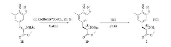 路线四:原研公司报道了通过转氨酶构建氨基手性中心的路线[6,7],以化合物20为原料,先同亚硝酸叔丁酯反应构建吲唑环,然后通过卤素金属交换、Erlenmeyer–Plöchl、开环、水解、转氨酶催化、甲酯化反应得到中间体2(图7)。