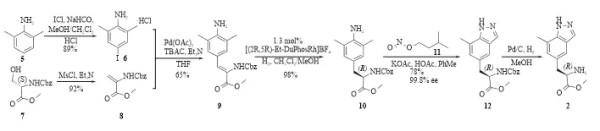 路线一(原研公司专利CN102834388B)[1]:以2,6-二甲基苯胺和N-苄氧羰酰基-L-丝氨酸甲酯为起始原料,分别经碘化和甲烷磺酰化/消除反应得到化合物6和8,然后再经4步反应(Heck偶联、不对称催化氢化、环化、脱Cbz)得到中间体2(图4)。