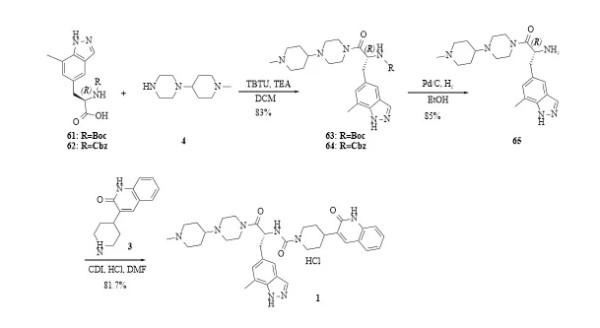 路线二[18]:化合物61(或62)和4经缩合、脱保护、偶联反应制备得到扎维吉泮(图15)。