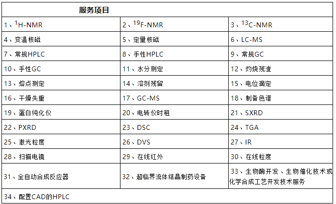 平台配备了二十多台大型科学仪器设备:化学家的“火眼金睛”——核磁波谱扫描仪、“分子量推测快捷小助手” ——液质/气质联用仪、不同型号的“纯化小能手”——制备色谱仪、“残留溶剂电子眼”——气相色谱仪、各类高效液相色谱仪。还配备有电位滴定仪、水分测定仪、马弗炉等小型专业仪器设备。除此之外,还有能为生物研发提供公共服务的蛋白纯化仪、电转仪等大型仪器设备。平台还与华东理工大学结晶工程国家重点实验室联合设立共享实验室,可为客户提供各种涉及晶型检测的服务,包括XRPD(X射线粉末衍射)、DSC(差示扫描量热)、TGA(热重分析)、SXRD(X射线单晶衍射)等。